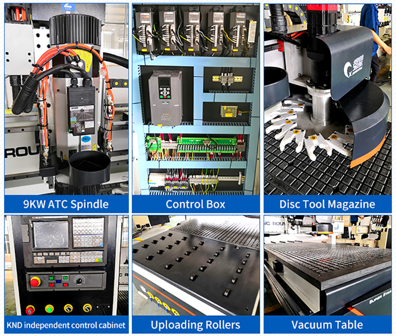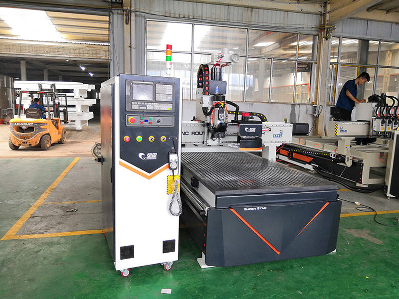 El soporte para máquina enrutadora CNC Superstar ATC adopta el sistema Taiwan LNC o Syntec, que puede realizar un mecanizado estable y de alta precisión, y admite 12 herramientas de cambio rápido. Se utiliza principalmente en el tallado de muebles de madera.