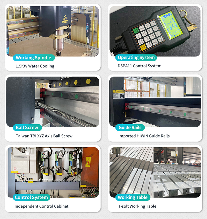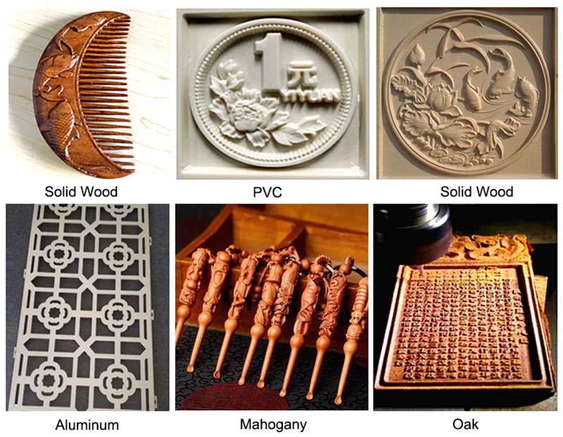 Material de procesamiento: procesamiento de grabado, fresado y corte para acrílico, PVC, tableros de densidad, piedras artificiales, vidrio orgánico, plásticos y láminas de metales blandos como cobre y aluminio.