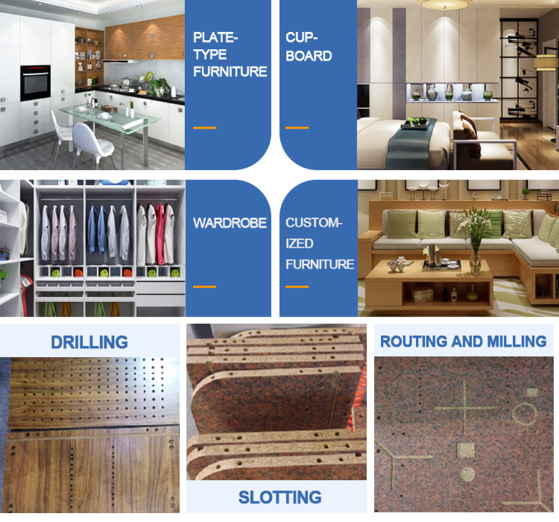 Se utiliza principalmente en la producción de la industria de muebles de paneles, se utiliza principalmente para seis lados (orificios para bisagras, orificios pasantes, mitades de orificios pasantes) y brochado horizontal de varios paneles a base de madera.