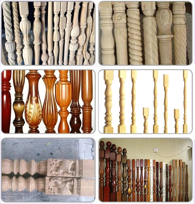 Escaleras, balaustres de escaleras, postes de escalera para escaleras; patas de mesa de comedor; patas de mesa auxiliar; patas de mesa de sofá; patas de taburete de bar; patas de silla; postes de brazo de silla; camillas de silla; barandillas de cama; postes de luz; bates de béisbol, etc.